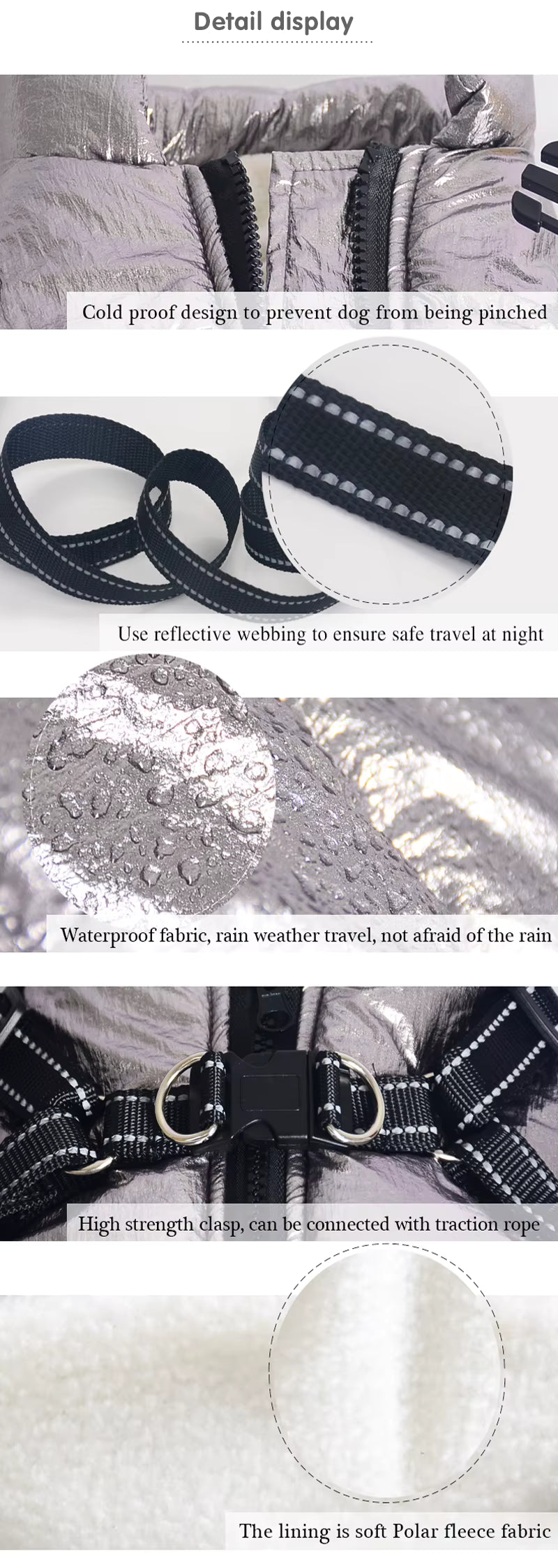 The jacket uses a large back zipper, designed for quick and hassle-free dressing. This makes it easier for dogs who dislike stepping through leg openings.